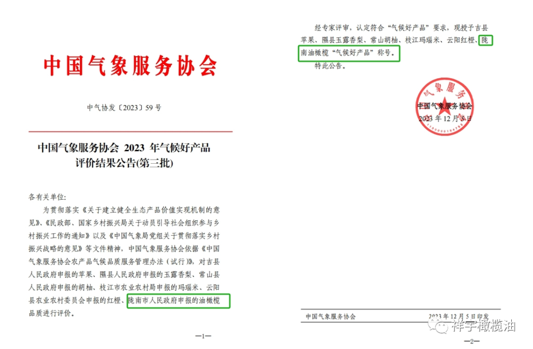 隴南油橄欖榮獲2023年“氣候好產(chǎn)品”稱號