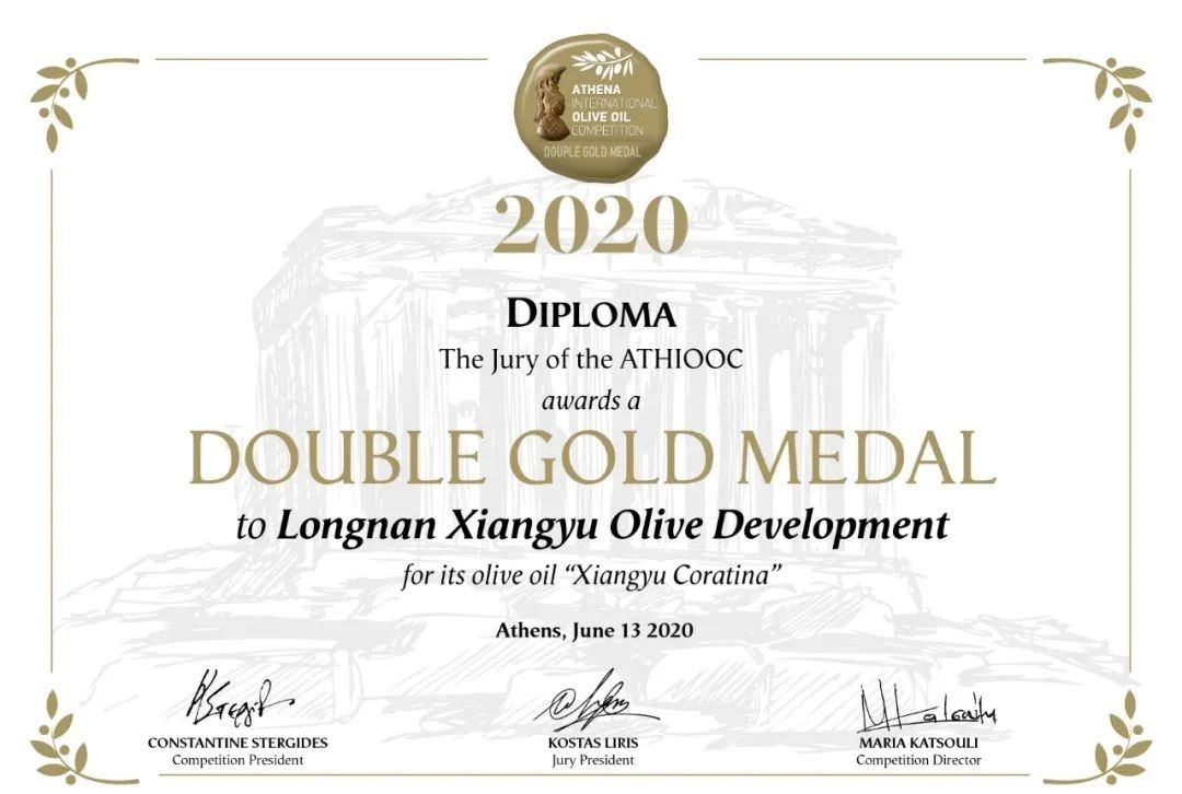 2020年在希臘國際橄欖油大賽中,隴南祥宇橄欖油又從來自全球430份橄欖油樣品中一舉奪魁,