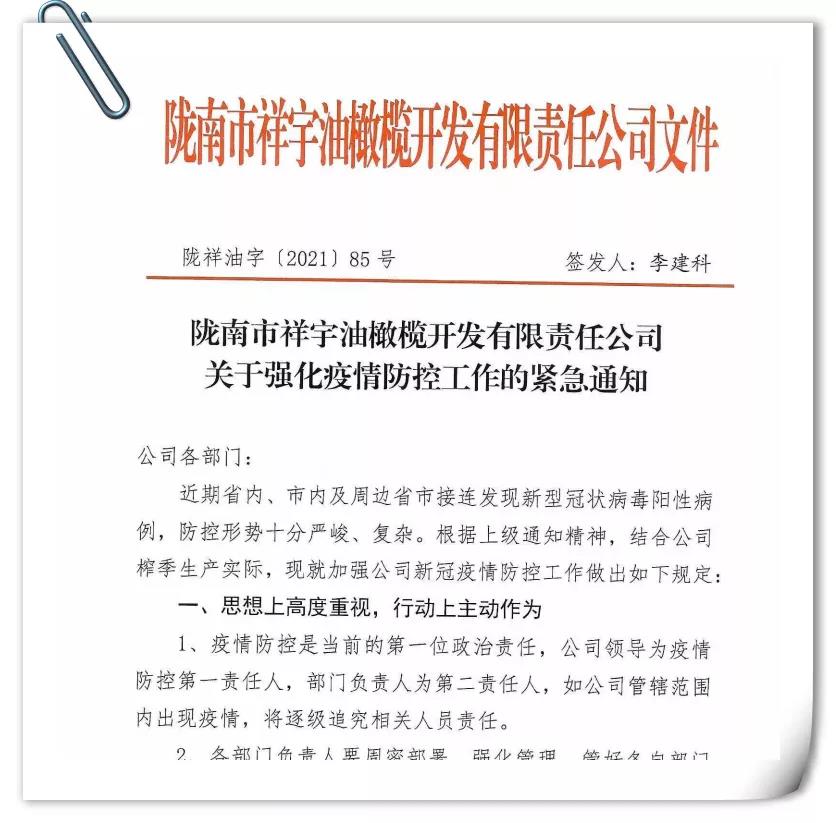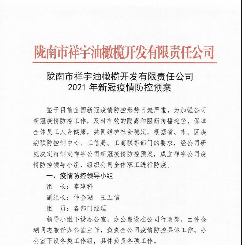 確保今年油橄欖鮮果收購工作圓滿完成,隴南市祥宇油橄欖開發(fā)有限責(zé)任公司根據(jù)實(shí)際情況及時(shí)成立了疫情防控小組,