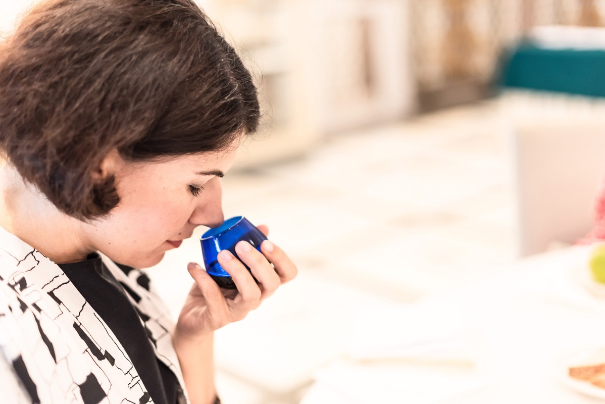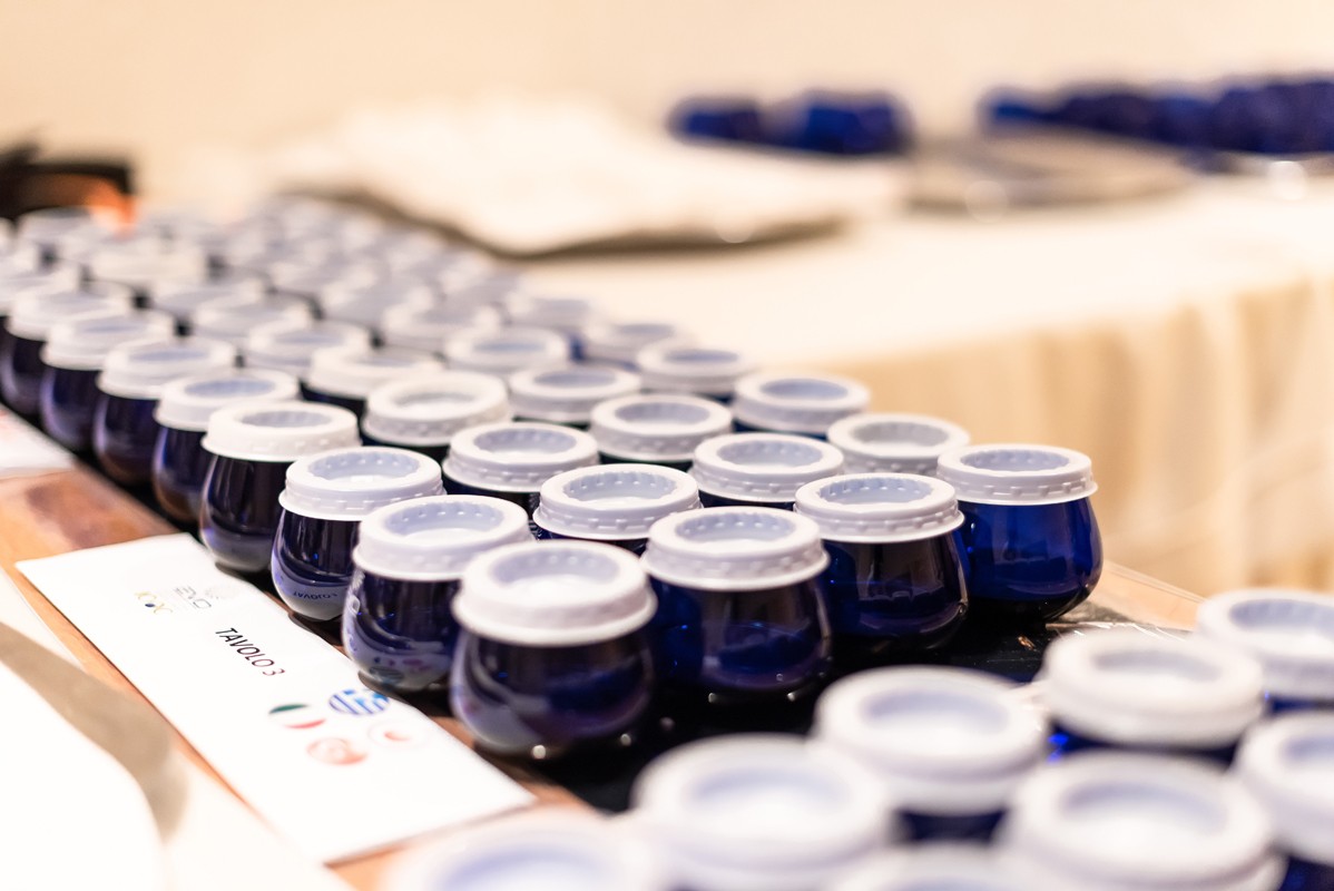 評(píng)委們使用橄欖油,感官評(píng)價(jià)專(zhuān)用藍(lán)色品鑒杯,在同一時(shí)間、